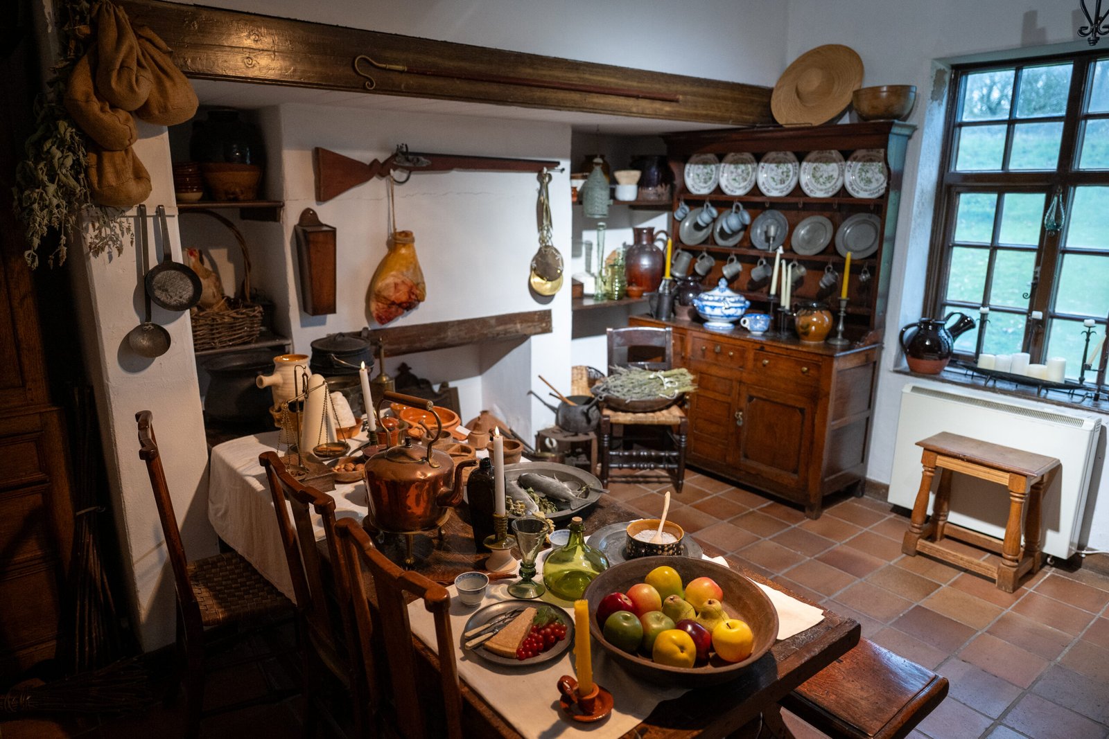 Inside, oak beams, stone floors and hand-carved furniture reveal a home built to endure — practical, elegant and rooted in its landscape.